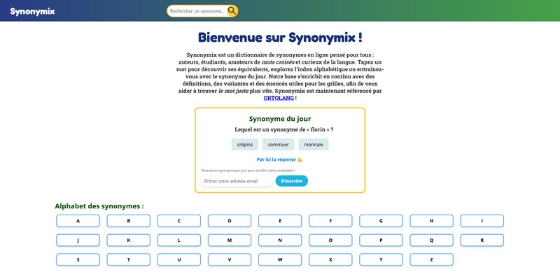 Synonymix est un dictionnaire de synonymes en ligne simple, clair et gratuit. Il permet de rechercher rapidement des mots équivalents, classés selon leur degré de proximité et leurs différents sens. L’interface est épurée, sans publicité ni distraction, et propose aussi un index alphabétique et un “synonyme du jour”, utile pour enrichir son vocabulaire au quotidien.