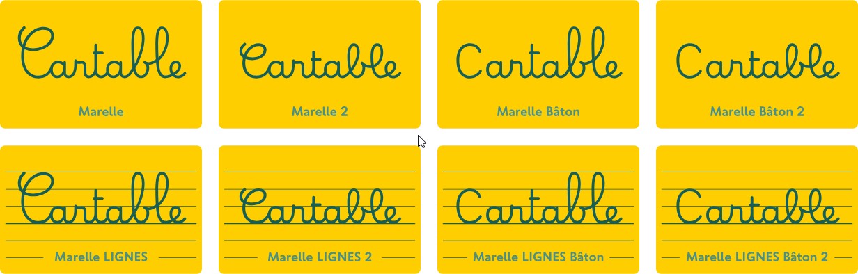 La police Marelle est conçue spécifiquement pour l’enseignement de l’écriture cursive à l’école élémentaire, elle a été développée par une équipe d’enseignants et designers spécialisés dans les systèmes d’écriture.